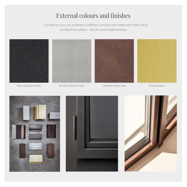 • wide variety of finishes – standard colours e.g. black, white, grey; any RAL colour; metallic colours e.g. bronze, gold; or a custom liquid metal finish e.g. antique brass, antique copper
