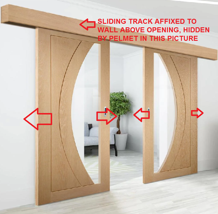 The door could be hung from a sliding track that is fixed to the wall above the opening. When the door is opened, it slides across the face of the wall.